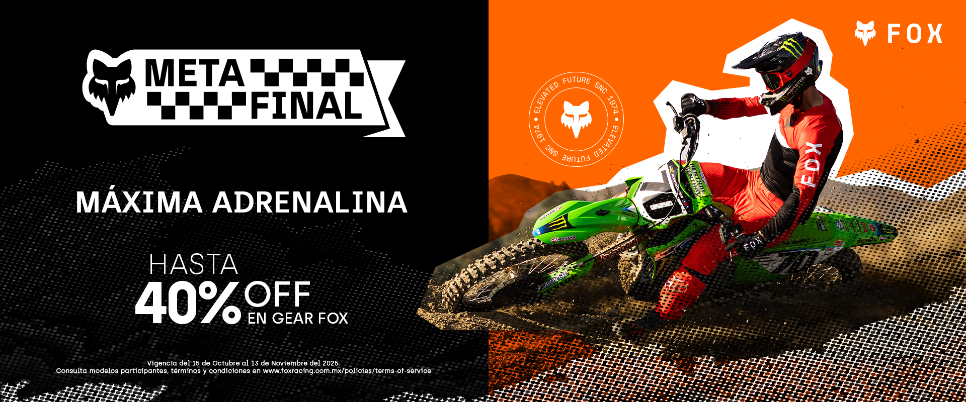 Vive la Meta Final FOX. Aprovecha los descuentos de hasta -40% en equipo de motocross: jerseys, pantalones, cascos, guantes y más. Equípate con la calidad y estilo FOX Racing, la marca líder en gear de moto, motocross y off-road. ¡La pista no espera, esta es tu última oportunidad para rodar con todo!